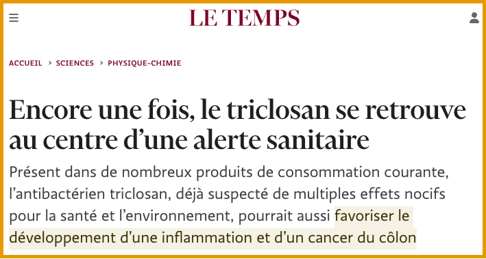 [3] https://www.letemps.ch/sciences/une-triclosan-se-retrouve-centre-dune-alerte-sanitaire#:~:text=toxicologie text=Un%20nouveau%20 soup%C3%A7on%20 sanitaire%20p%C3%A8se,d'un%20 cancer%20du%20c%C3%B4lon.